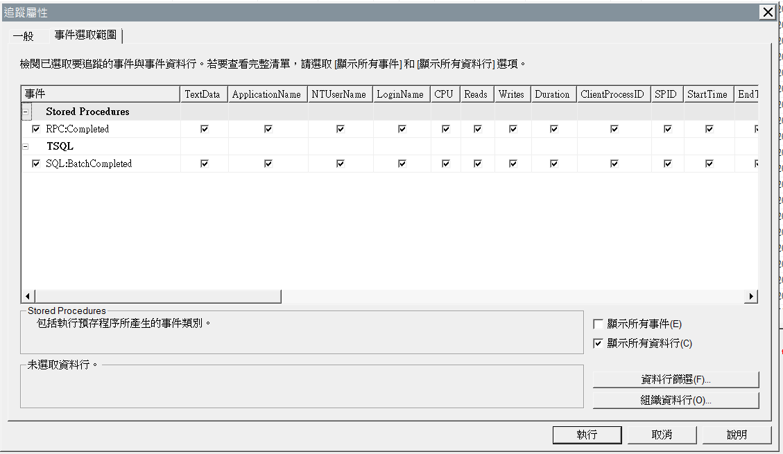 1.事件選取範圍→選取事件RPC:Completed及SQL:BatchCompleted