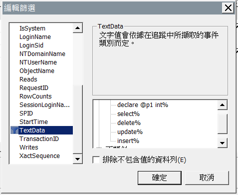 在TextData新增declare @p1 int%select%update%delete%insert%