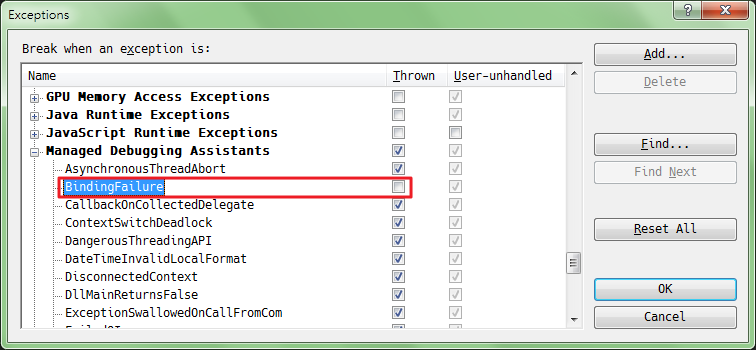 2.[Debug]>>[Exceptions]>>[Managed Debugging Assistants]>>[BindingFailure]>>取消Thrown