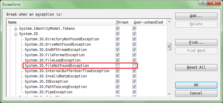 1.[Debug]>>[Exceptions]>>[Common Language Runtime Exceptions]>>[System.IO]>>[System.IO.FileNotFoundException]>>取消Thrown & User-unhandled