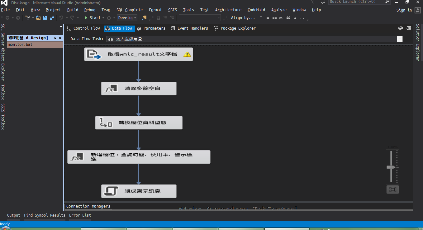 3.使用SSIS解析文字檔,將超標數值設為[Parameters],當使用率大於等於超標界線時即發信通知管理者。