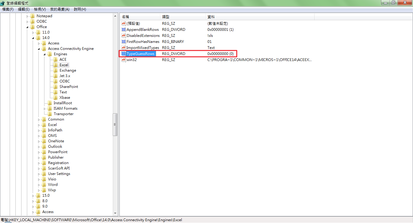 2.讀Excel的主機(開發區&正式區)的登錄檔需修改TypeGuessRows:8→0,