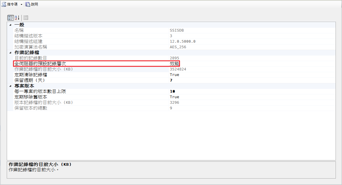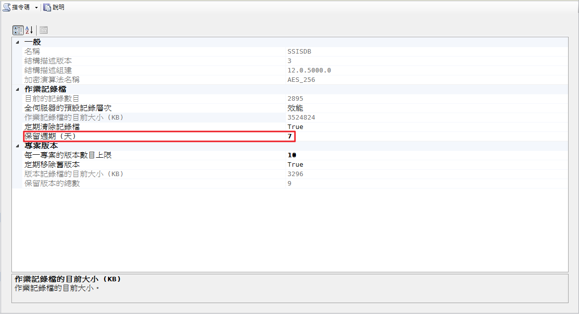 SSISDB的[作業記錄檔]>>[保留週期]預設為365天, 在運行一段時期後,排程週期 x 執行專案數量 x 專案的元件數 所產生的log