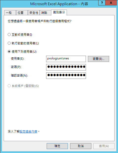 4.【內容】>>【識別身份】頁籤>>【使用下列使用者】新增執行SQL AGENT的帳號(本例為prologium/mes)