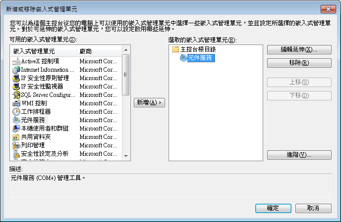 2.【檔案】>>【新增/移除崁入式管理單元】>>新增【元件服務】