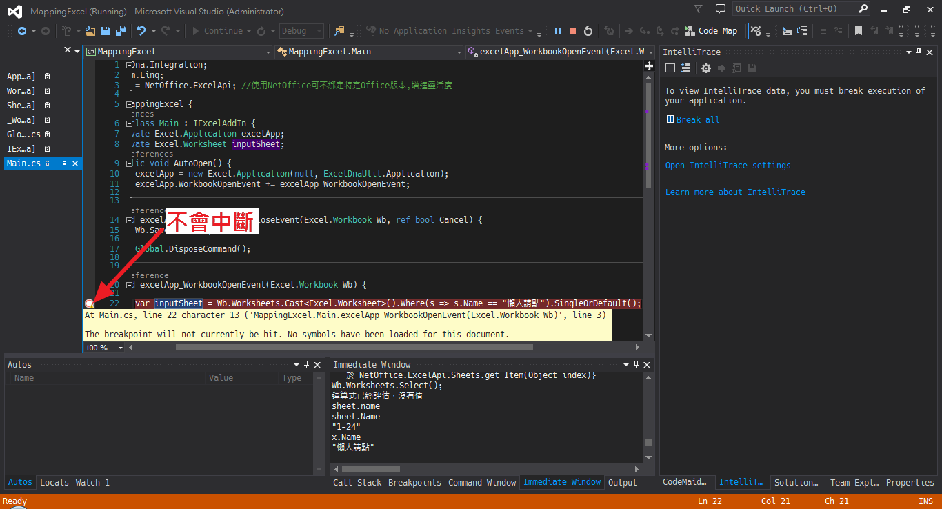 Excel-DNA已設中斷點卻不會中斷
