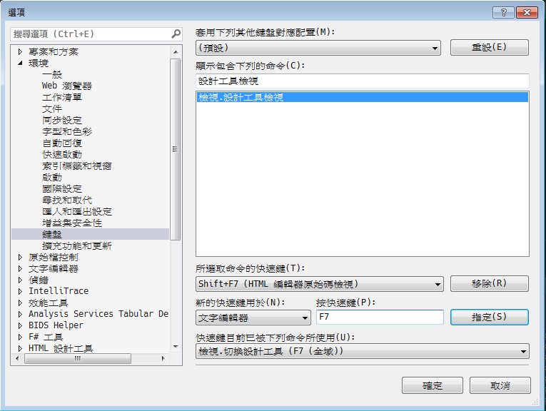 1_在Visual Studio的工具列的[工具]>[選項],選項視窗的[環境]>[鍵盤]輸入命令”設計工具檢視”,新增快速鍵”F7”,用於”文字編輯器”