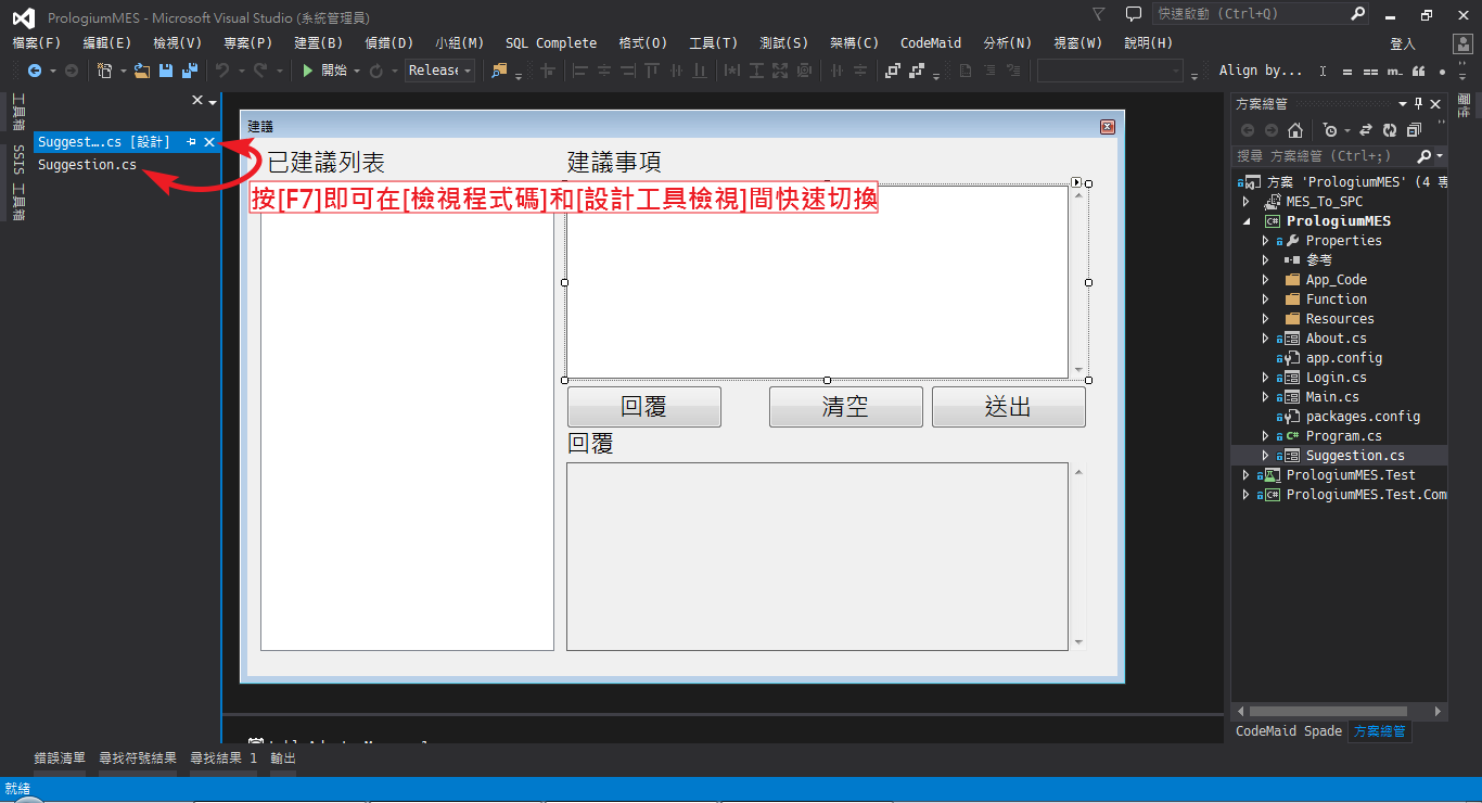 2_即可只用單一快速鍵”F7”就能在[檢視程式碼]←→[設計工具檢視]模式間快速切換