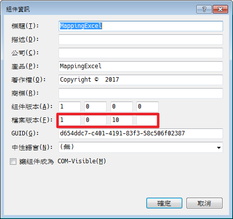 1_專案屬性>應用程式>組件資訊>檔案版本確實是1.0.10。