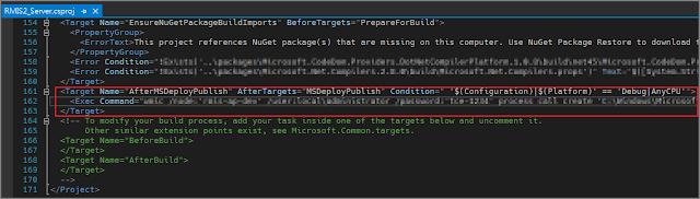<Target Name="{自訂Task名稱}" AfterTargets="MSDeployPublish" Condition="{在哪種組態下執行}"> <Exec Command="{自訂命令}" /> </Target>