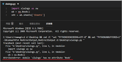狀況: Debug時會顯示錯誤, 訊息為module ‘xlwings’ has no attribute ‘Book’