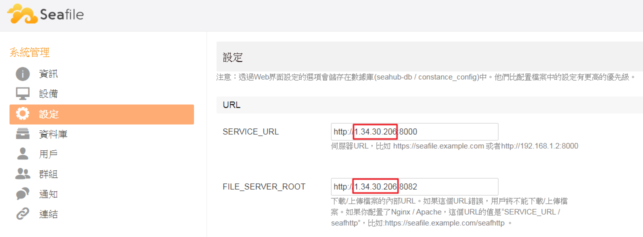 12.如果Seafile服務有對外需修改設定(改成對外IP)
