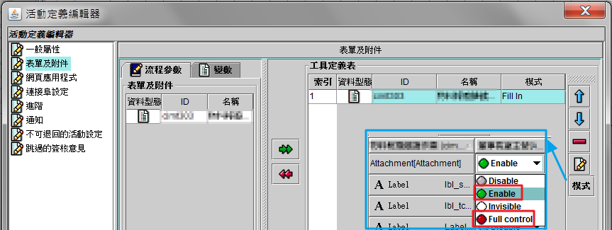 Enable→只有上傳者能刪除自己的檔案(不限在哪個關卡上傳)Full Control→能刪除表單所有檔案(可在第一關[流程發起者]設定)