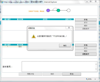 下圖藍色是主管退回,在修正後送出仍要重跑每一關才到主管,