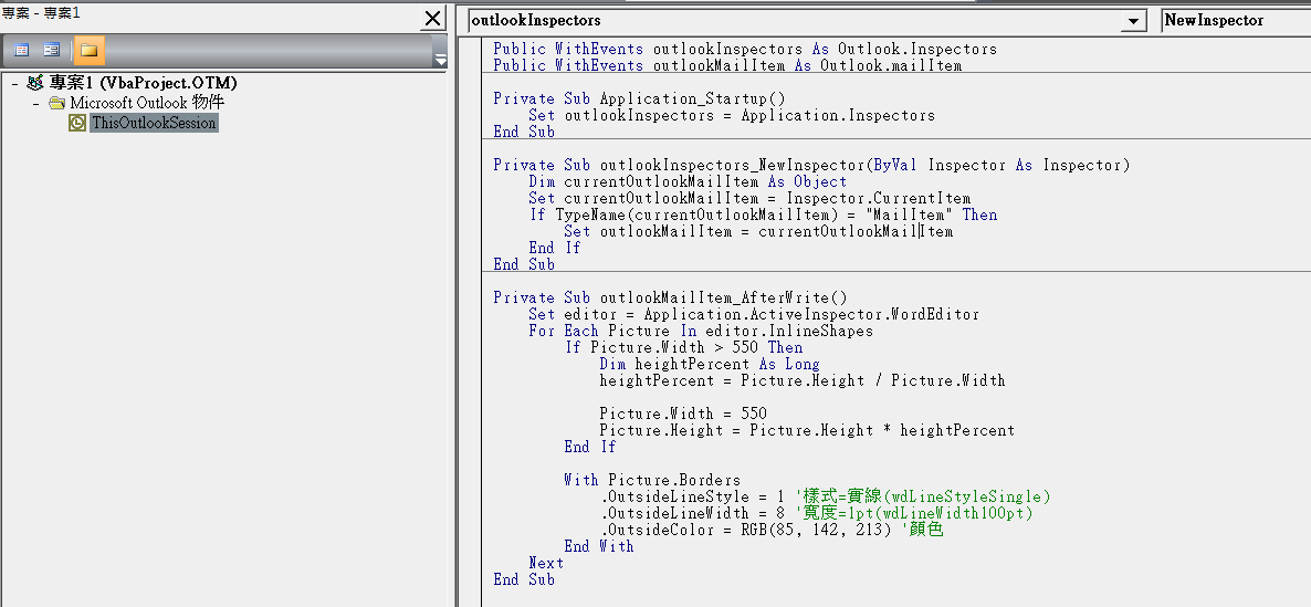 '發現outlookMailItem_Write事件並不會每次都觸發,所以改在BeforeCheckNames事件(檢查名稱前)