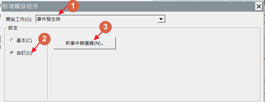 1.觸發程序選擇”事件發生時”→”自訂”→”新事件篩選器”。