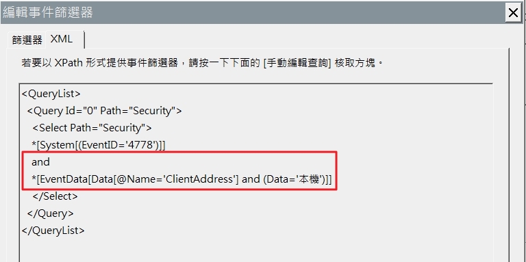 2.設定已有條件,再按”XML”頁籤新增自訂條件。