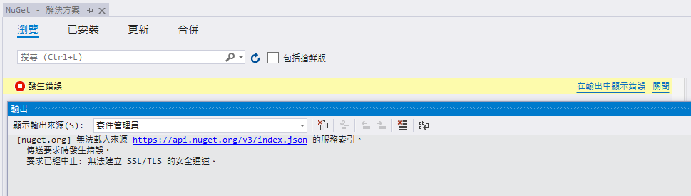 原因:Nuget於2020/04移除對TLS 1.0/1.1的支援。