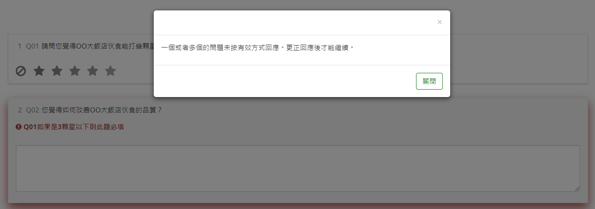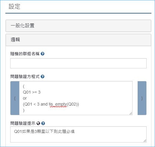 並在設定>邏輯>問題驗證提示填入”Q01如果是3顆星以下則此題必填”。