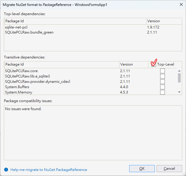 但SQLite-net相依的SQLitePCLRaw NuGet套件在v2.1.0後需要使用PackageReference管理。