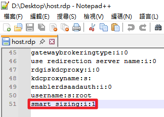 2.在連線設定檔(.rdp)新增或修改屬性 smart sizing:i:1
